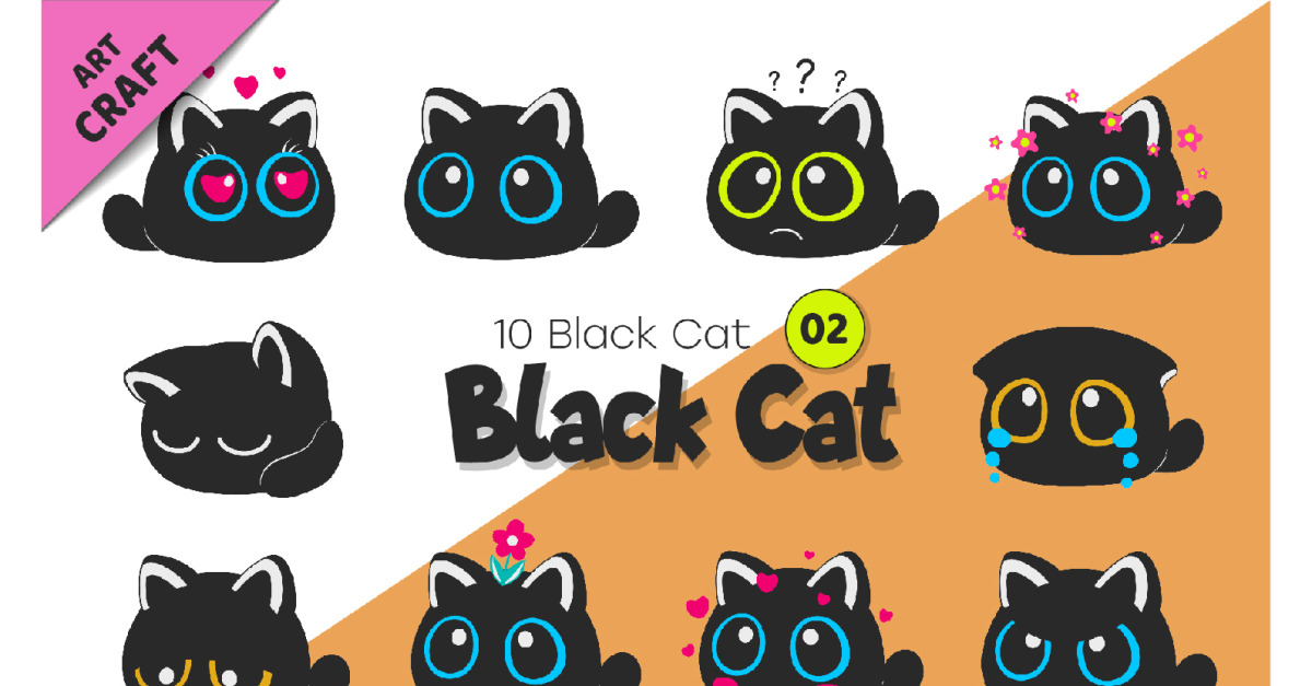 Set of Black Cats 02. T-Shirt, PNG. Set of 10 black cats, made in Minimalistic style of flat silhouette, in black and white colors. Characters look mischievous and playful. Simple, bold shapes, clean vector design, black and white color scheme. Positive and unique design. Children’s bright illustration. Use the product …