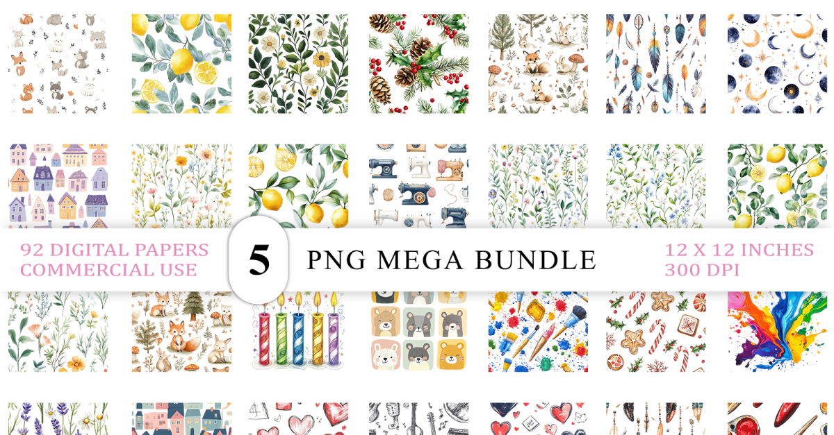 92 Whimsical Mixed Pattern Backgrounds PNG Bundle | Premium Quality | Commercial Use Ready This colorful Whimsical Seamless Pattern Bundle brings joy and versatility to your creative projects. With over 92 hand-drawn seamless patterns, this set spans multiple themes-including festive treats, cozy villages, florals, fruits, hearts, animals, art elements, and …